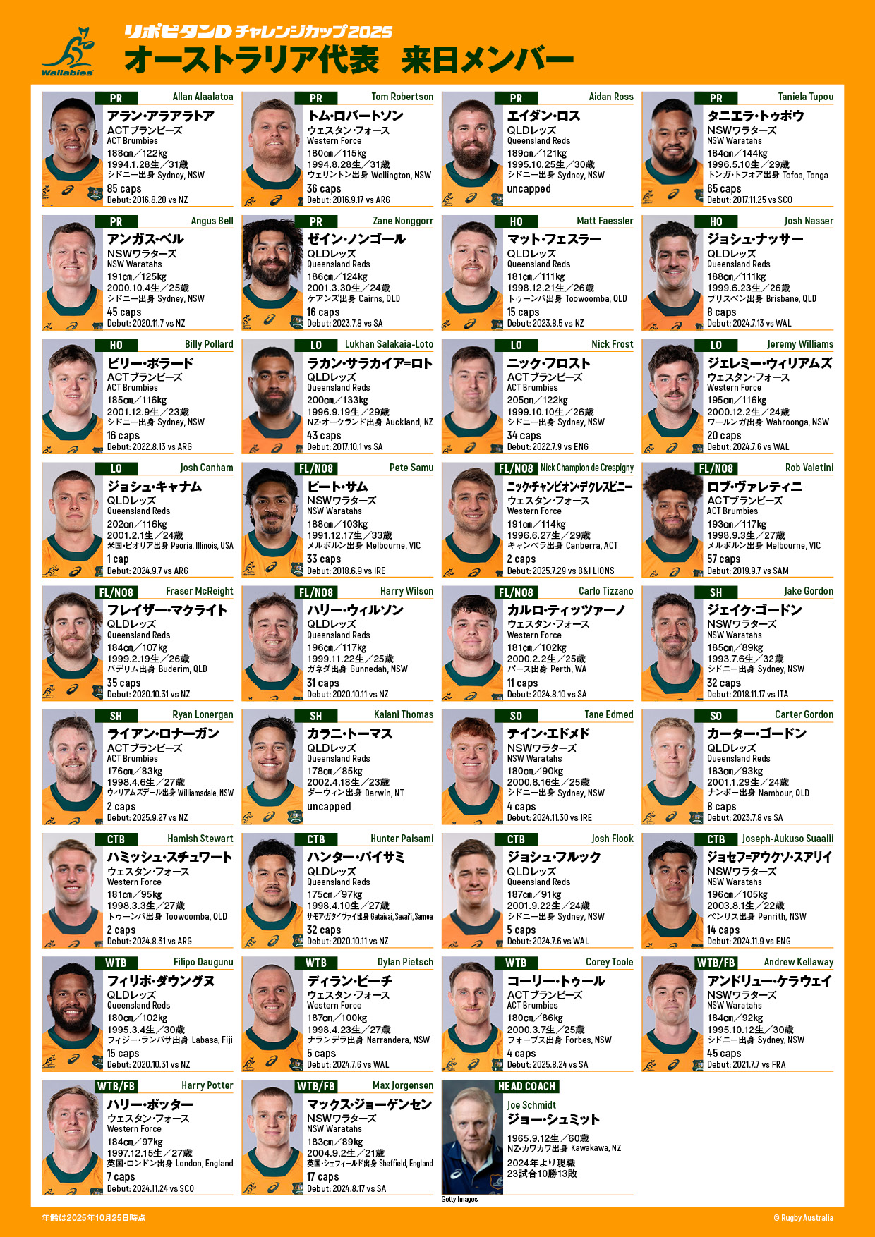 【オーストラリア代表“ワラビーズ” 2025日本・欧州遠征スコッド】(34名)