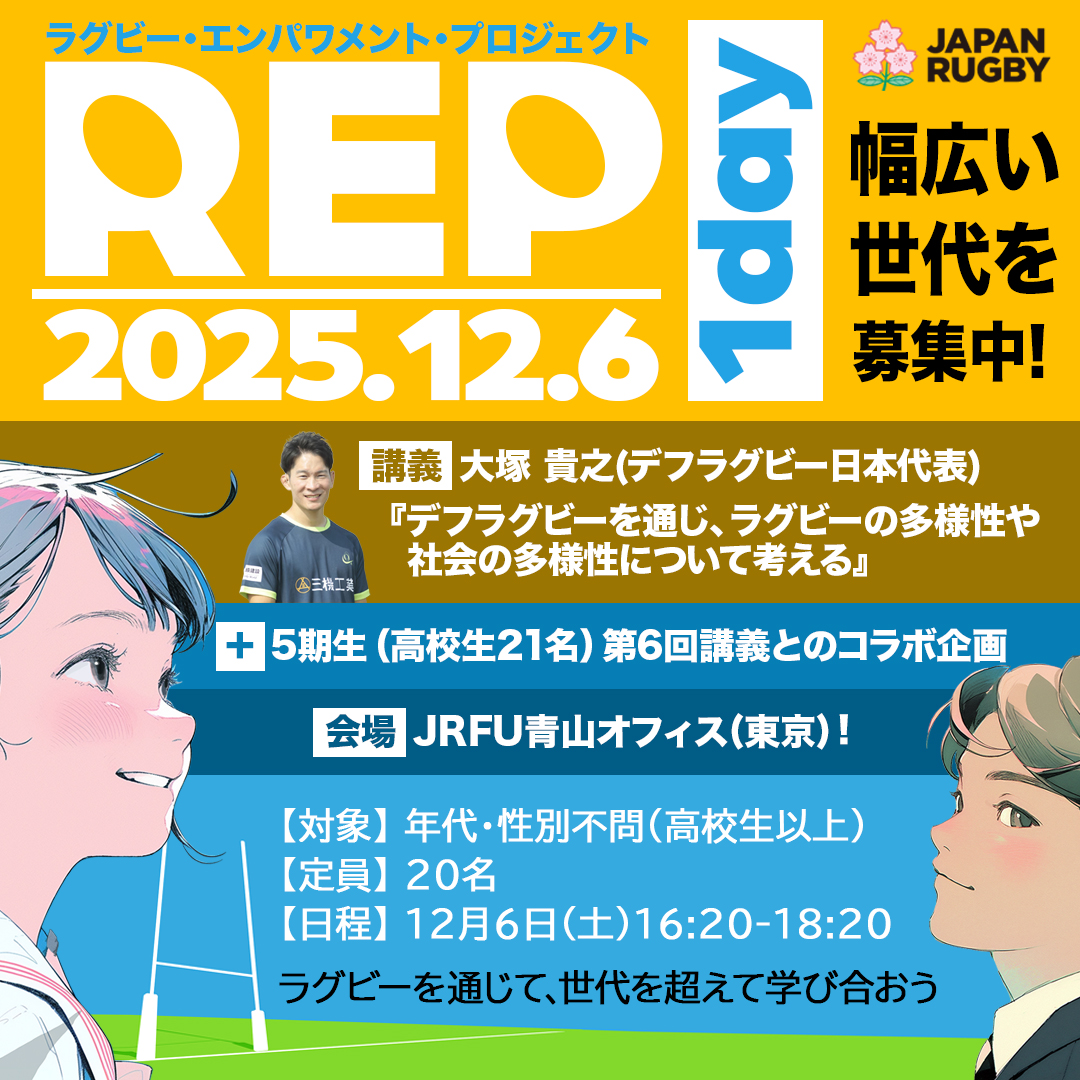 「2025年度ラグビー・エンパワメント・プロジェクト」12/6 1dayセッション、コラボ決定。高校生以上は参加可。