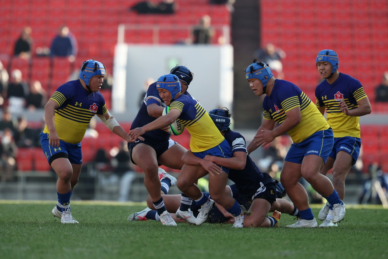 しかし、すぐさま桐蔭も反撃に出る。直後のキックオフをPR田邊隼翔のタックルでマイボールにすると、一度はボールを手放すもFB曽我大和のランで好機を生み出し、9フェーズ目に再びボールを受けた曽我がトライラインを越えた。